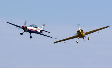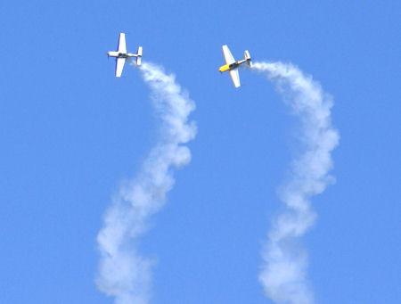 青い飛行機と黄色い飛行機。息が合っています。